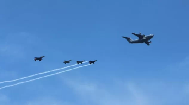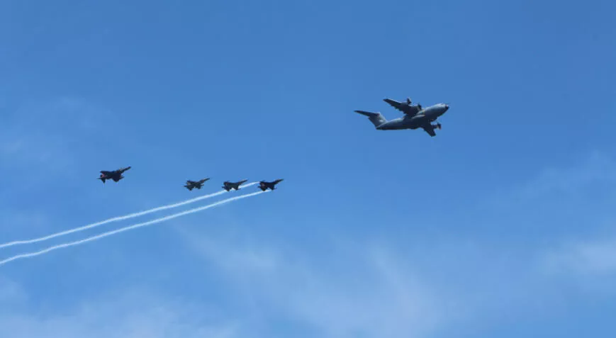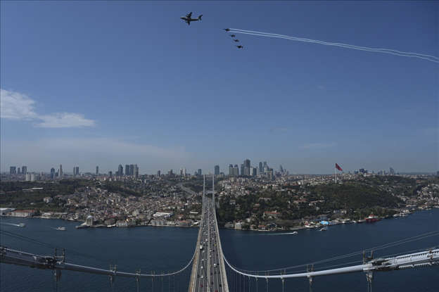Türk Hava Kuvvetleri’ne ait F16, F48 ve A400 M Tipi uçaklarla Solo Türk uçağı İstanbul Boğazı üzerinde uçtu. Uçaklar, İstanbul Boğazı üzerinde selamlama uçuşu yaptı. Türk Hava Kuvvetlerine ait kargo uçağı uçuş sırasında önde yer alırken, diğer dört uçak ise, selamlama uçuşu sırasında arkada yer aldı.