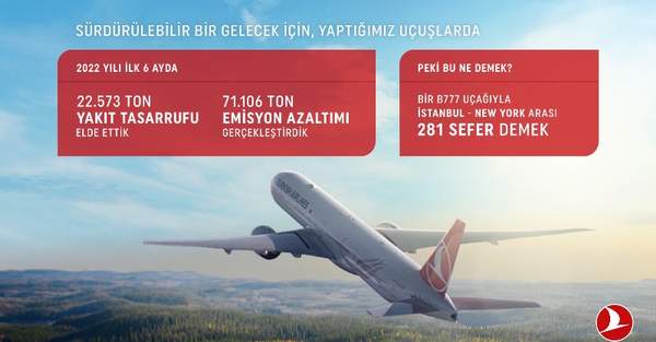 Türk Hava Yolları (THY) sürüdürlebilir havacılık yakıtı ile 2022’nin ilk 6 ayında İstanbul-New York arasında 281 sefere denk gelen 22 bin 573 ton yakıt tasarrufu sağladı. Havayolu ayrıca aynı sürede 71 bin 106 ton emisyon azaltımı gerçekleşti.