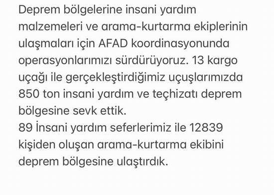 Türk Hava Yolları (THY), 13 kargo uçağıyla gerçekleştirilen yardım uçuşlarında 850 ton yardım malzemesi ve 89 insani yardım seferi ile 12 bin 839 arama kurtarma ekibini deprem bölgesine ulaştırdı.
