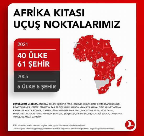 THY, 2005 yılında başlattığı Afrika politikası çerçevesinde bu kıtada 5 ülkede 5 kente yaptığı uçuş sayısını 40 ülke, 61 şehre çıkardı.