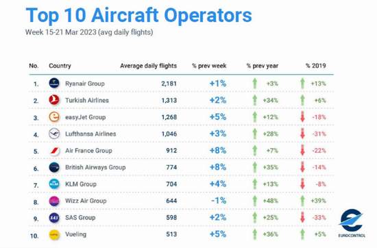 Eurocontrol’ün 15-21 Mart tarihlerindeki uçuş verilerine göre, Ryanair Group günlük 2 bin 181 uçuşla Avrupa’daki 10 büyük havayolu arasında ilk sırada yer aldı.