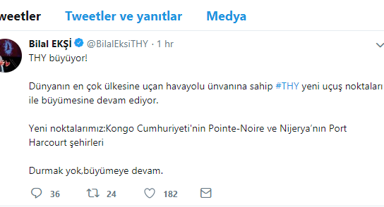 THY Genel Müdürü Bilal Ekşi, sosyal medya platformu twitter üzerinden yeni uçulacak rotaları açıkladı. Bilal Ekşi yaptığı açıklamada” THY büyüyor. Dünyanın en çok ülkesine uçan havayolu ünvanına sahip #THY yeni uçuş noktaları ile büyümesine devam ediyor. Yeni noktalarımız:Kongo Cumhuriyeti’nin Pointe-Noire ve Nijerya’nın Port Harcourt şehirleri. Durmak yok,büyümeye devam” dedi.