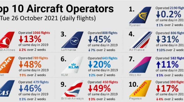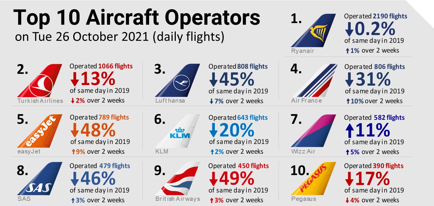 Avrupa Hava Seyrüsefer Emniyeti Teşkilatının (EUROCONTROL), 26 Eylül’deki hava trafiği verilerine göre, yeni tip koronavirüs (Kovid-19) önlemleri kapsamındaki kısıtlamaların büyük oranda kalkmasıyla İrlandalı Ryanair, günlük 2 bin 190 uçuşla Avrupa’nın en çok uçan hava yolu olarak kayıtlara geçti.