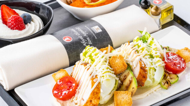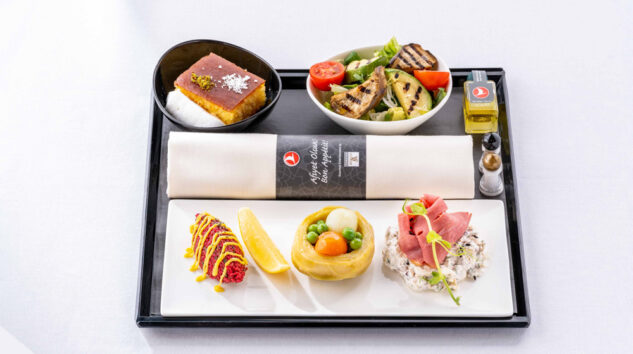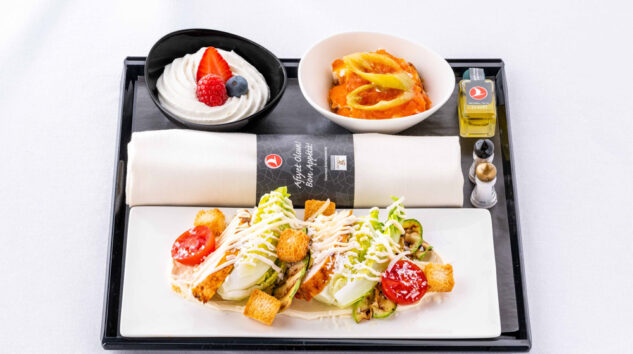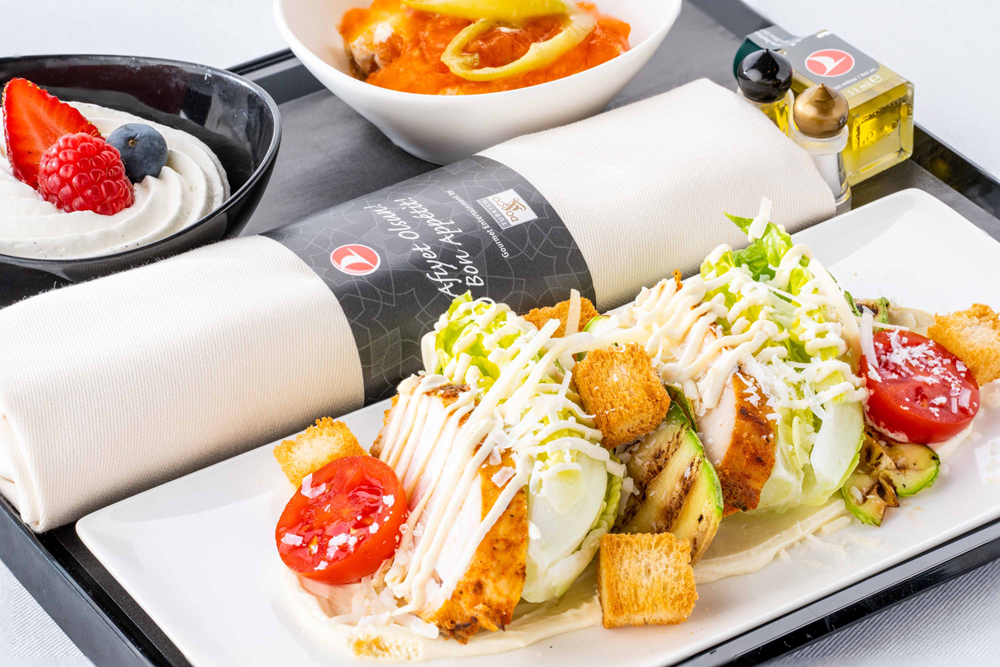 Sağlıklı beslenme trendleri takip edilerek, protein, sebze, meyve ağırlıklı ve daha az karbonhidratlı menüler tasarlayan Türk Hava Yolları’nın uçuşlarda sunduğu yemekler uzman aşçılar tarafından günlük olarak, en taze ürünlerle, butik olarak üretilmekte.