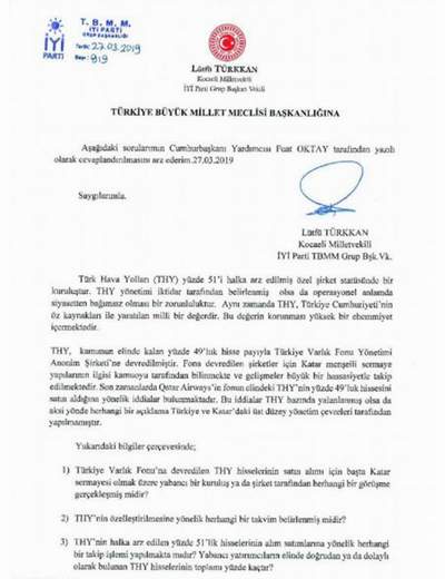 THY’nin yüzde 49’unun Qatar Airways’e satılacağı iddiaları bu kez Meclis’in gündemine taşındı. İYİ Parti Grup Başkanvekili Lütfü Türkkan, Cumhurbaşkanı Yardımcısı Fuat Oktay’ın yanıtlaması isteğiyle soru önergesi verdi.