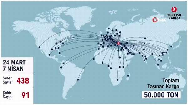 Bayrak taşıyıcı havayolu şirketi Türk Hava Yolları’nın alt markası Turkish Cargo, korona virüsle mücadelede hava kargo taşımacılığında ilaç ve medikal ürünleri taşıyarak dünyanın ayakta kalmasına katkı sağlamaya devam ediyor. Bu kapsamda THY, son iki haftada dünyanın farklı noktalarındaki 91 şehrine gerçekleştirdiği toplam 438 seferle, 50 bin ton kargo taşıdı.