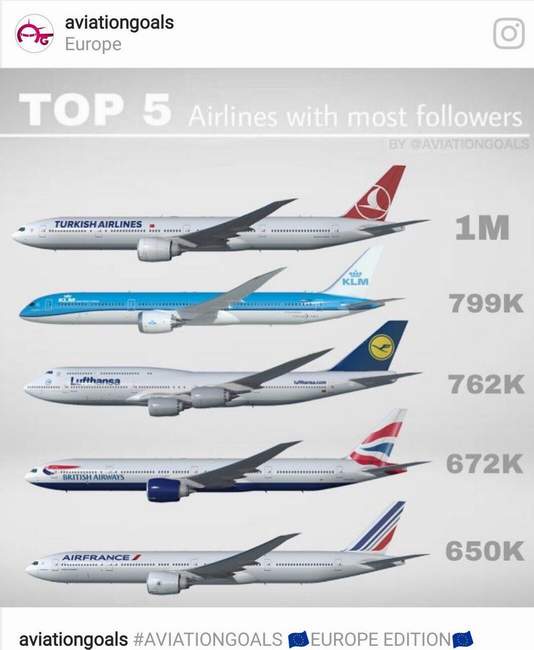 Dünyanın en çok noktasına uçan Havayolu olan Türk Hava Yolları ,sosyal medyada da birinci. Yaklaşık 1 Milyon takipçisi olan Türk Hava Yolları, Avrupa en çok takipçisi olan havayolu oldu.
