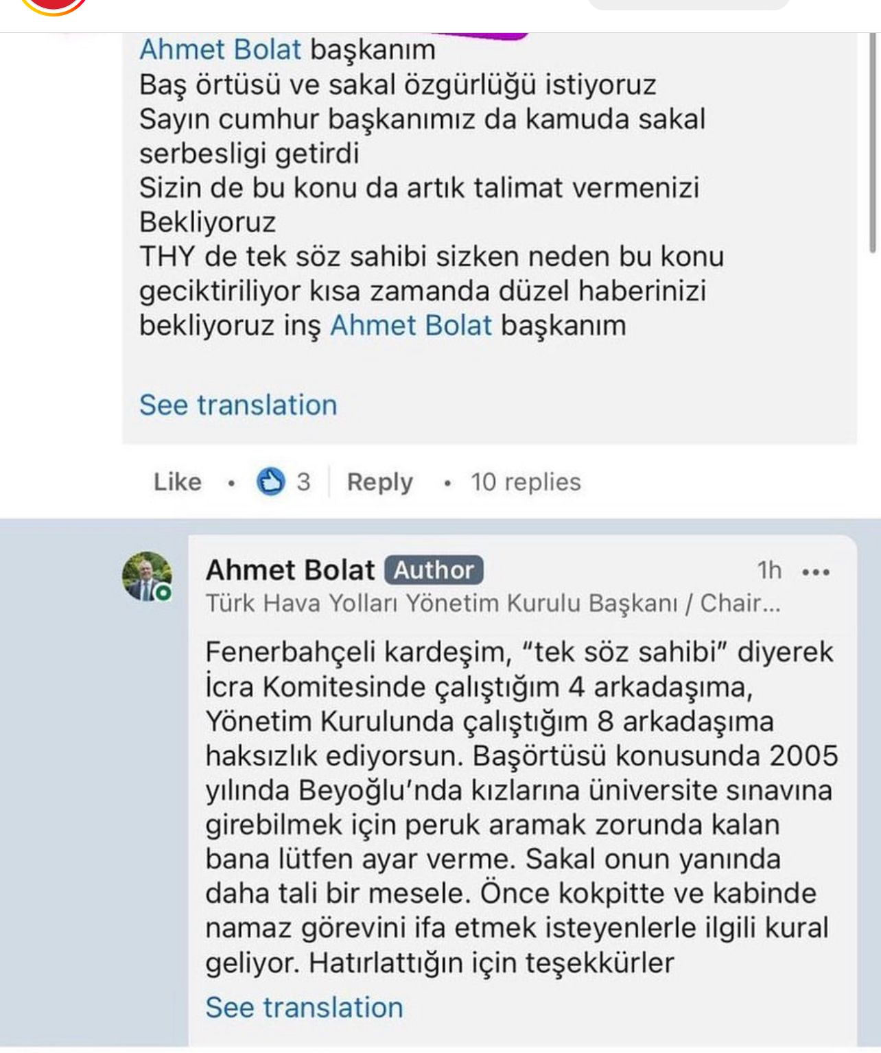 Türk Hava Yolları Yönetim Kurulu Başkanı Ahmet Bolat, sosyal medya platformu LinkedIn üzerinden takipçilerinin sorularını yanıtladı. Fenerbahçe kullanıcı adıyla Bolat’a, “Ahmet Polat başkanım başörtüsü ve sakal özgürlüğü istiyoruz sayın cumhurbaşkanımız da kamuda sakal serbestliği getirdi sizin de bu konuda artık talimat vermenizi bekliyoruz THY’de tek söz sahibi sizken neden bu konu geciktiriliyor. Kısa zamanda güzel haberlerinizi bekliyoruz inşallah Ahmet Bolat başkanım”