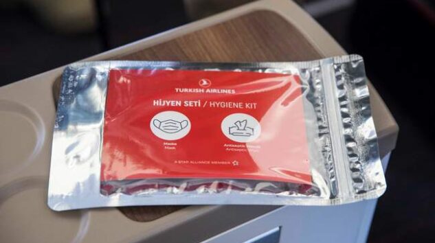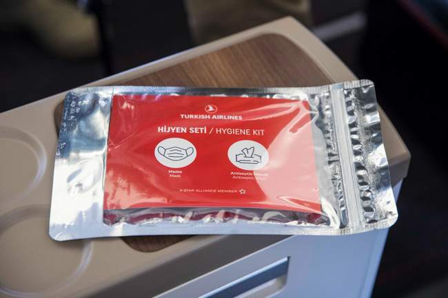 Türk Hava Yolları(THY), korona virüsle mücadele doğrultusunda alınan güvenli seyahat standartları kapsamında yolculara içerisinde maske, dezenfektan ve antiseptik mendil bulunan hijyen seti vermeye başladı.