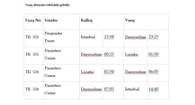 Milli hava yolu, kıtanın en hızlı gelişen başkentlerinden olan Lusaka’yı Afrika’daki uçuş ağına ekleyerek pandemi sebebi ile ara verdiği seferlerine yeniden başladı. Türk Hava Yolları’nın Lusaka uçuşları, 26 Mart 2023 tarihi itibarıyla Darüsselam aktarmalı olarak haftada iki frekans gerçekleşecek.