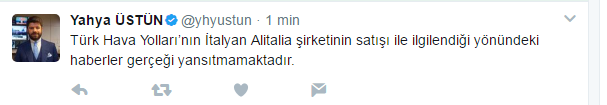 THY Basın Müşaviri Yahya Üstün resmi twiter hesabından yaptığı açıklamada,internet sitelerinde yeralan haberlerin gerçeği yansıtmadığını yazdı.