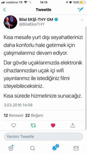 Yakın mesafede yolculara sunulması planlanan Wifi müjdesini ise Türk Hava Yoları(THY) Genel Müdürü Bilal Ekşi verdi. Sosyal medya hesabı Twitter’dan konuya ilişkin paylaşım yapan Ekşi, “Kısa mesafe yurt dışı seyahatlerinizi daha konforlu hale getirmek için çalışmalarımız devam ediyor. Dar gövde uçaklarımızda elektronik cihazlarınızdan uçak içi wifi yayınlarımız ile istediğiniz filmi izleyebileceksiniz. Kısa sürede hizmetinize sunacağız” sözleriyle hazırlıkları süren çalışmayı duyurdu.