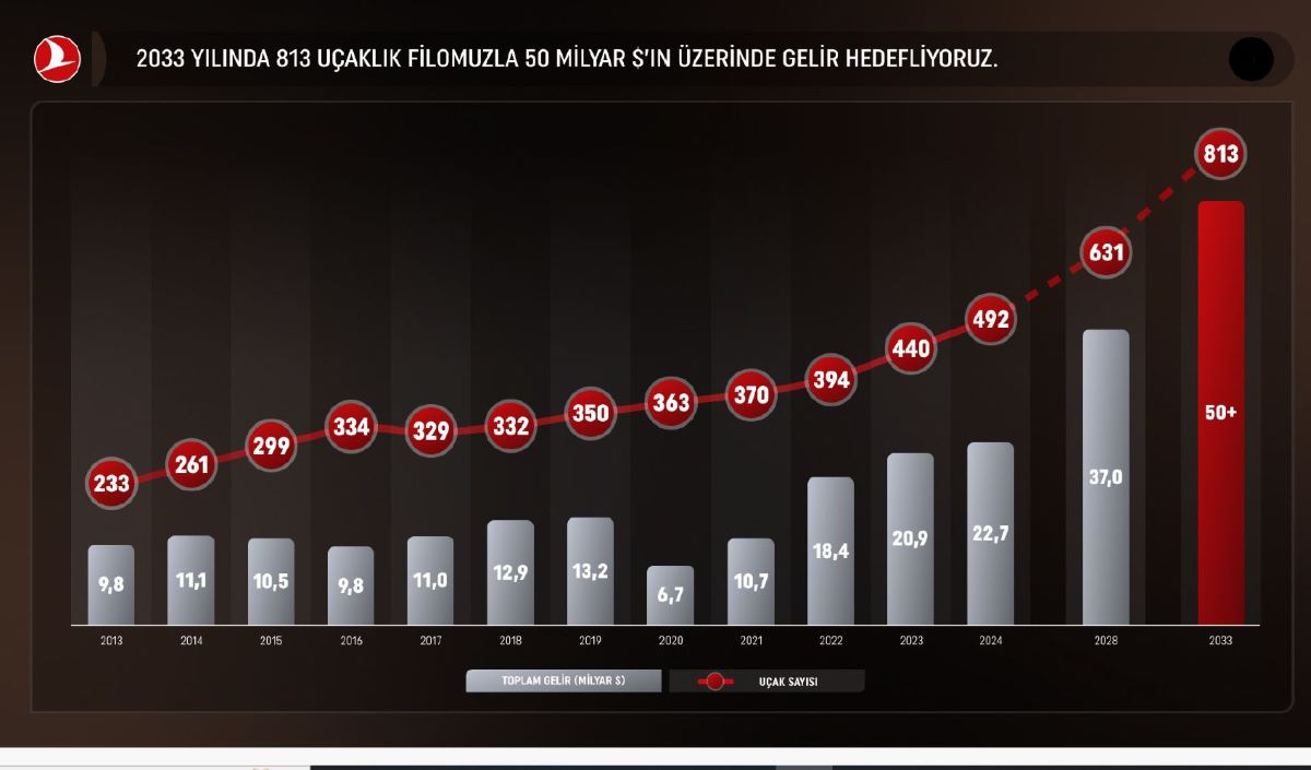 THY Genel Müdürü Bilal Ekşi, sosyal medya hesabından yaptığı paylaşımda 2033 yılı hedefleri doğrultusunda 813 uçaklık filo ve 50 milyar Dolar’ın üzerinde gelir hedeflediklerini açıkladı. Ekşi’nin paylaştığı grafikte şirketin yıl yıl büyüme hedefleri yer aldı. Hedefler doğrultusunda 2028 yılında 37 milyar dolarlık bir gelir beklenirken, uçak filosunun 631’e yükselmese ön görülüyor.