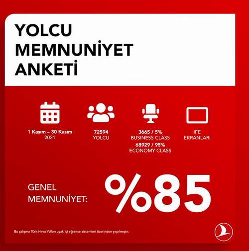 Türk  Hava Yolları’nın  (THY) 72 bin yolcu ile yapılan kasım ayı uçak içi yolcu anketinde ‘genel memnuniyet ‘ oranı yüzde 85 oldu.