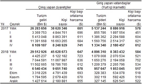 Turizm geliri Ekim, Kasım ve Aralık aylarından oluşan IV. çeyrekte bir önceki yılın aynı çeyreğine göre yüzde 7,1 artarak 6 milyar 540 milyon 434 bin dolar oldu. Turizm gelirinin (cep telefonu dolaşım ve marina hizmet harcamaları hariç) yüzde 82,6’sı yabancı ziyaretçilerden, yüzde 17,4’ü ise yurt dışında ikamet eden vatandaş ziyaretçilerden elde edildi.