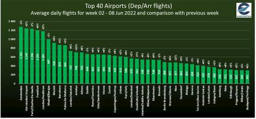 EUROCONTROL tarafından 09 Haziran 2022 tarihinde yayınlanan Kapsamlı Değerlendirme Raporu’nda yer alan 02-08 Haziran dönemi ülkemize ait hava trafik istatistiklerine göre; Türkiye, günlük ortalama 3006 uçuş ile Avrupa’da en yoğun trafik hacmine sahip ülkeler arasında altıncı sırada yer aldı. Bu ortalama ile Pandemi öncesi istatistiklerin %89’una ulaşıldı.  Avrupa genelinde ise aynı döneme ait günlük ortalama 29 bin 27 uçuş ile 2019 yılına ait seviyenin yüzde 85’ine ulaşıldı.