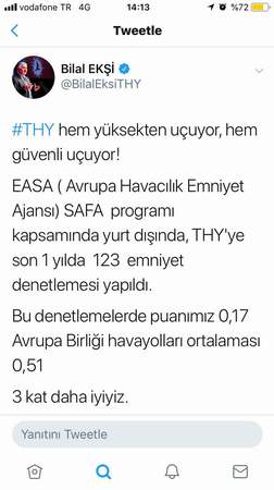 Avrupa Sivil Havacılık Emniyeti Ajansı’nın denetlemelerinde büyük başarı sağlayan Türk Hava Yollarının bu başarısını resmi twitter hesabından duyuran THY Genel Müdürü Bilal Ekşi, ” THY hem yüksekten uçuyor. Hem de güvenli uçuyor. Avrupa Sivil Havacılık Emniyeti Ajansı (EASA) SAFA programı kapsamında yurt duşunda, THY’ye son 1 yılda 123 denetleme yapıldı. Bu denetlemelerde puanımız 0,17. Avrupa Birliği Havayolları ortalaması 0,51 . 3 kat daha iyiyiz ” paylaşımı ile duyurdu.
