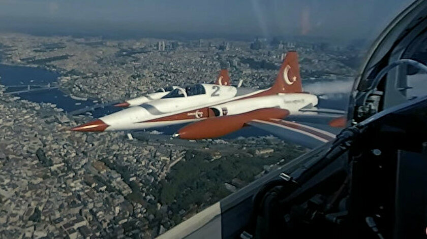Milli Savuma Bakanlığının (MSB), Twitter hesabından yapılan paylaşımda, “Kahraman Türk pilotlarının cesaret ve yeteneğinin simgesi, Hava Kuvvetlerimizin akrobasi timi Türk Yıldızları’nın İstanbul semalarındaki nefes kesici gösteri uçuşunu 360 derece açıyla izlemek ister misiniz?” ifadeleri kullanıldı.