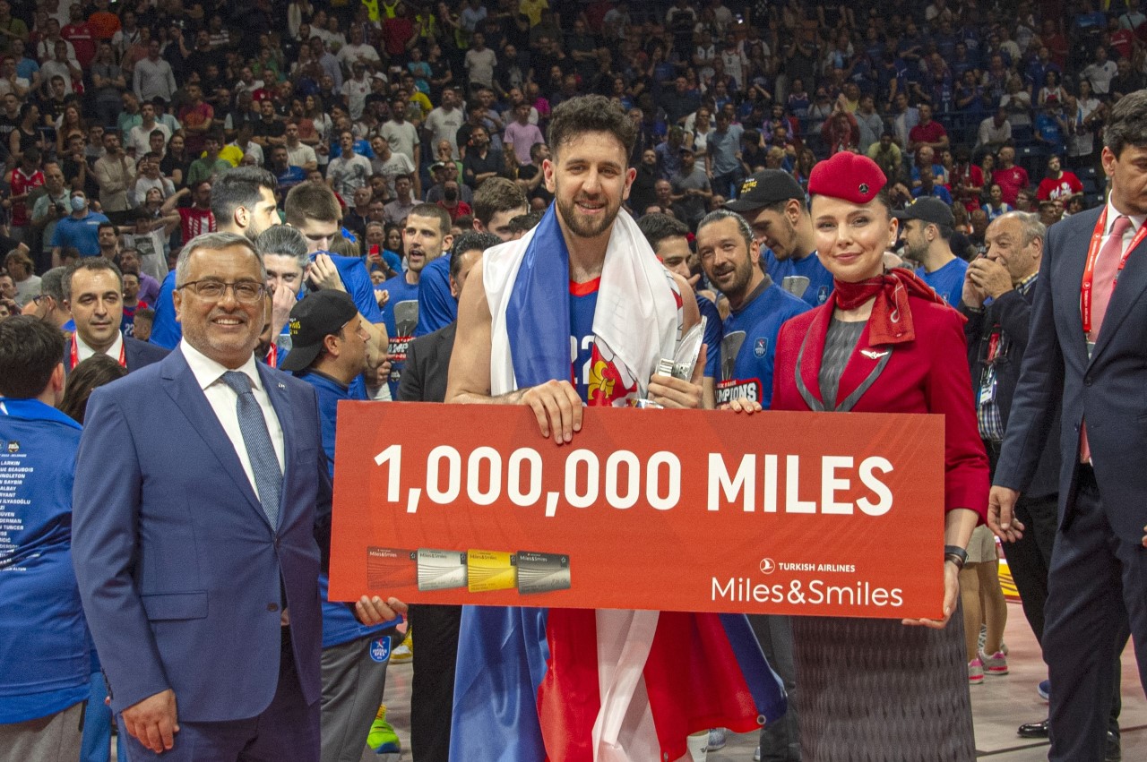 Üst üste ikinci kez final maçının en değerli oyuncusu (MVP) olan Vasilije Micic, 1 milyon Miles&Smiles Mili ödülünü Türk Hava Yolları Yönetim Kurulu ve İcra Komitesi Başkanı Prof. Dr. Ahmet Bolat’tan teslim aldı.