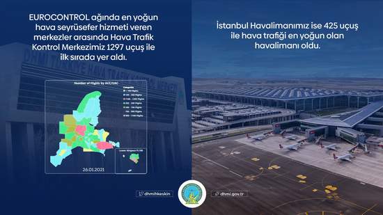 Konuyla ilgili olarak resmi twitter adresinden bir açıklama yapan Devlet Hava Meydanları İşletmesi (DHMİ) Genel Müdürü Hüseyin Keskin, “EUROCONTROL ağında 26 Ocak günü en yoğun hava seyrüsefer hizmeti veren merkezler arasında Hava Trafik Kontrol Merkezimiz 1297 uçuş ile ilk sırada yer aldı. İstanbul Havalimanımız ise 425 uçuş ile en yoğun havalimanı oldu” dedi.