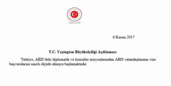 Türkiye’nin Washington Büyükelçiliği, de vize başvurularını sınırlı ölçüde almaya başladığını duyurdu. Elçilikten yapılan yazılı açıklamada, “Türkiye, ABD’deki diplomatik ve konsüler misyonlarından ABD vatandaşlarının vize başvurularını sınırlı ölçüde almaya başlamaktadır” ifadeleri kullanıldı.