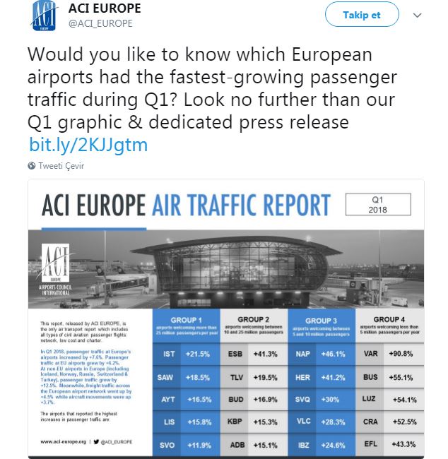 Türkiye’de havacılık büyümeye devam ederken, havalimanları’da Avrupa’nın zirvesine oturdu. Tüm Avrupa Havalimanları arasında ,2018 yılının ilk 3 ayında en çok yolcu artışı yaşanan havalimanları Türkiye’den.  Türk Hava Yolları Genel Müdürü Bilal Ekşi, sıralamayı sosyal medya hesabından duyurdu.