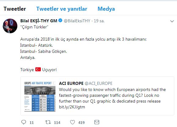 Yılın ilk 3 ayında yüzde 21.5 yolcu artışı ile Atatürk Havalimanı Avrupa’nın zirvesinde yer alırken, İstanbul Sabiha Gökçen Havalimanı yüzde 18.5 yolcu artışı ile ikinci, Antalya havalimanı ise yüzde 16.5 ile üçüncü oldu. Havacılıkta yaşanan bu büyük başarıyı resmi twitter hesabından duyuran  Türk Hava Yolları Genel Müdürü Bilal Ekşi,  “Çılgın Türkler”  Avrupa’da 2018’in ilk üç ayında en fazla yolcu artışı ilk 3 havalimanı: İstanbul- Atatürk. İstanbul- Sabiha Gökçen.  Antalya. Türkiye Uçuyor! “ paylaşımını yaptı.