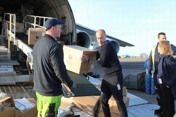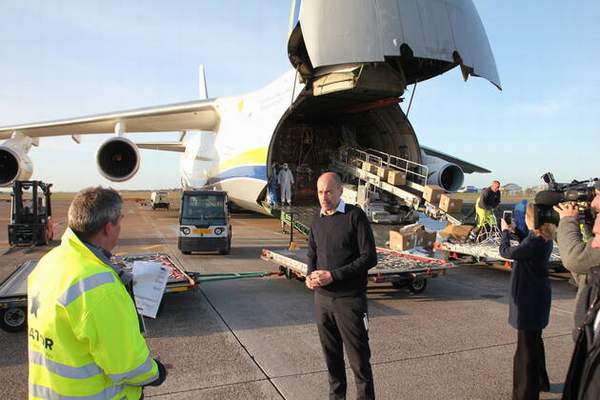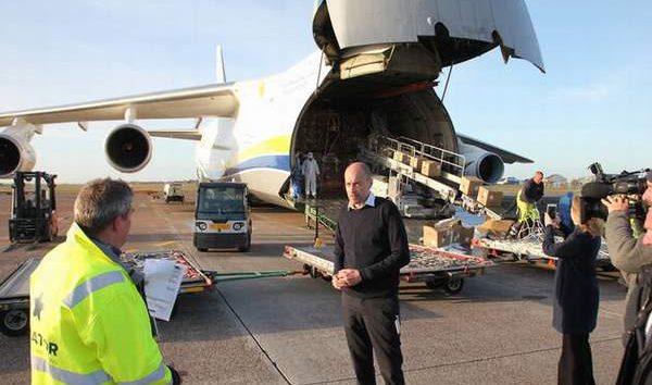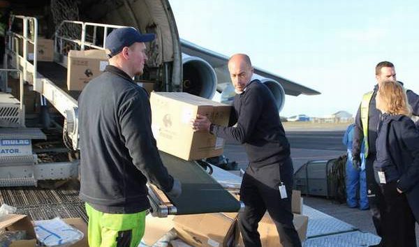 Dünyanın ikinci büyük kargo uçağı olan 150 ton yük taşıma kapasiteli dev Antonov An-124 kargo uçağı, Kopenhag’a iner inmez, Danimarka Sağlık Bakanı Magnus Heunicke de kolları sıvayarak koruyucu malzemelerle dolu kolileri görevlilerle birlikte taşıdı.