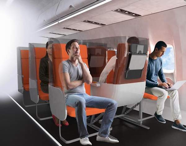 Aviointeriors’ın Instagram hesabından yayımladığı “Janus” koltuk tasarımında, koronavirüsün yayılma riskini azaltmak için yolcular arasına cam bölmeler konduğu görüldü