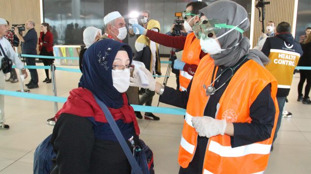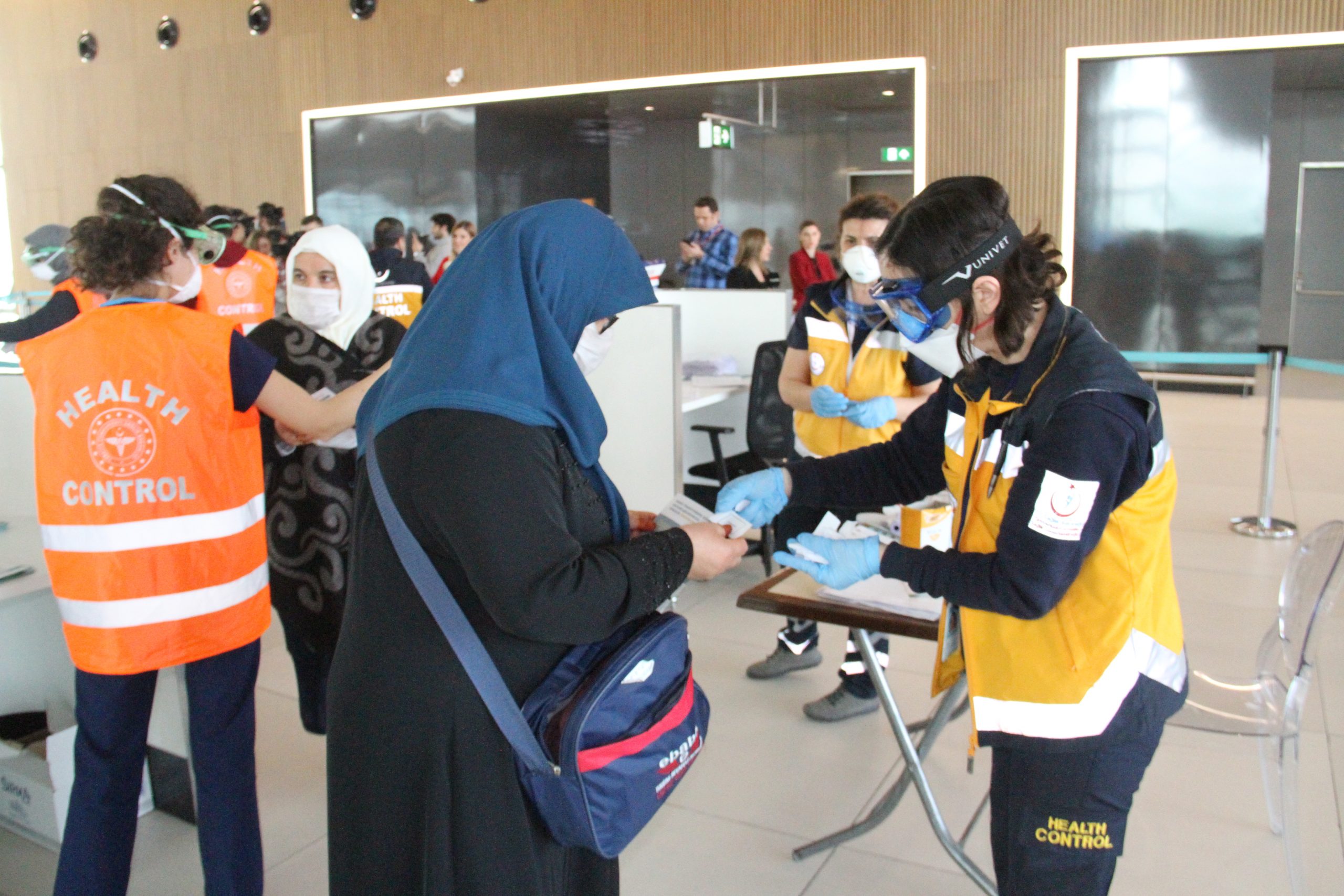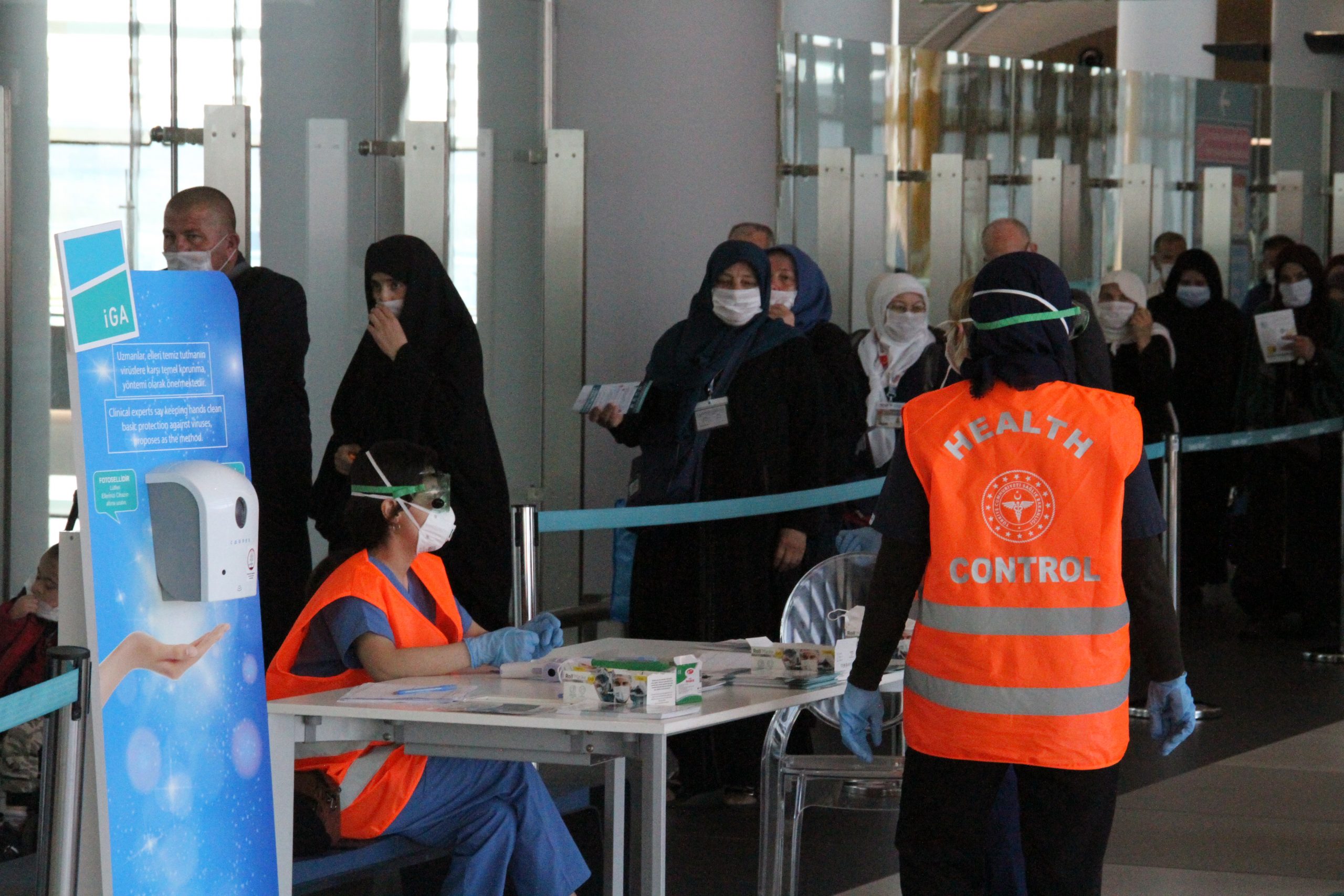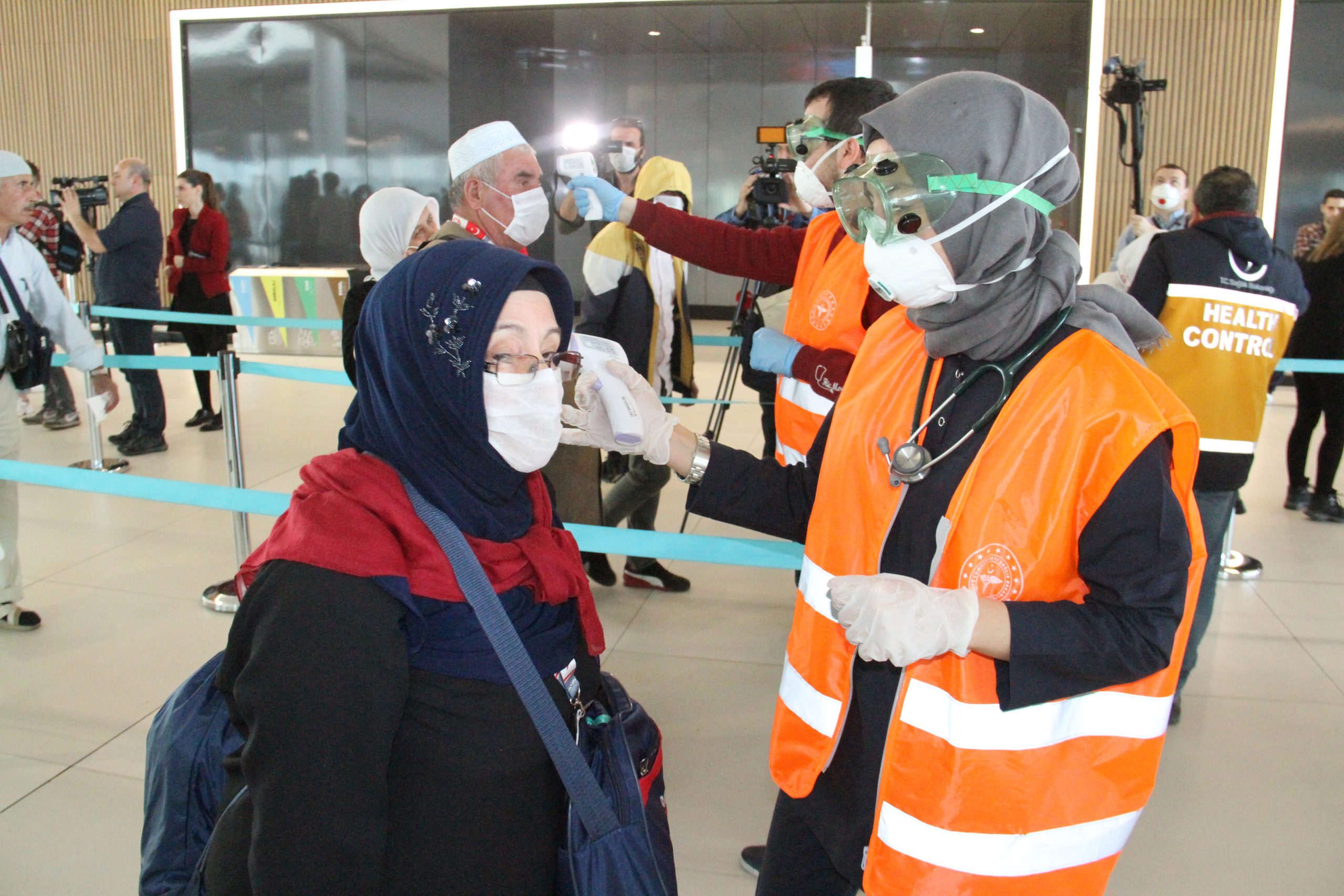 Kutsal topraklardan Türk Hava Yolları uçakları ile İstanbul Havalimanı’na gelen vatandaşlar için uçakta başlayan sağlık kontrolleri, havalimanında da sürdü. Uçağın kapısında Sağlık Bakanlığı Türkiye Hudut ve Sahiller Sağlık Genel Müdürlüğü ekipleri tarafından karşılanan yolcular, taramadan geçirildi. Yolculara tek tek sorular soran Sağlık Bakanlığı ekipleri, tüm yolcuları termal kameradan geçirerek ve ateşlerini ölçerek yurda girişini sağladı.