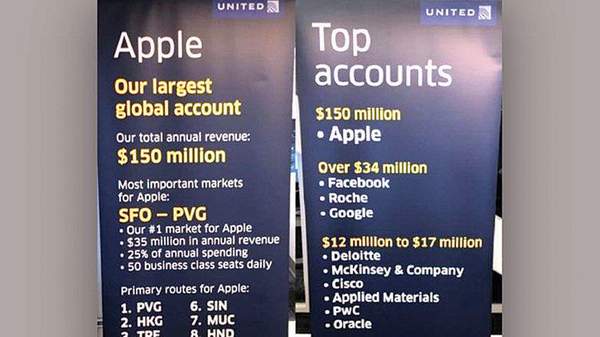 Apple’ın en çok bilet aldığı ülkelerin başında Çin var. Apple, Çin’e geçen yıl günde ortalama 50 business class bilet aldı. Sadece Apple’ın Çin biletlerine harcadığı para 35 milyon dolar olarak belirtildi. Apple’dan sonra 34 milyon dolardan fazla harcayan şirketler arasında Facebook, Roche ve Google var. 12 milyon dolar ile 17 milyon dolar arasında harcama yapan diğer şirketler arasında ise Deloitte, McKinsey, Cisco, Applied Materials, PwC ve Oracle yer alıyor. United Airlines’ın astığı bu afişlerden sonra şirkete tepkiler geldiği ve sonrasında ise bu afişle