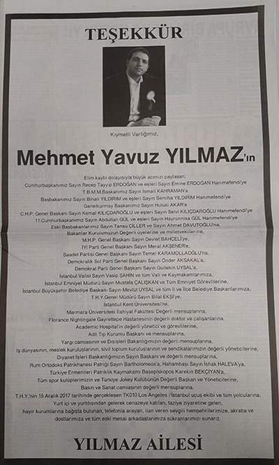Eski başbakanlardan Mesut Yılmaz ve eşi Berna Yılmaz’ın oğulları Yavuz Yılmaz’ın ölümüyle ilgili aile teşekkür ilanı verdi.
