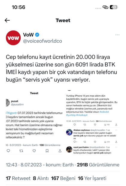 Yurt dışı telefonlarının izin bedelinin 20 bin lira olmasının ardından dün binlerce insan 6 bin TL’lik ödemeyi yaptı. Gün boyunca e-Devlet’te yoğunluk yaşanırken bugünse sosyal medyada birçok vatandaş, ödeme yapmalarına rağmen “servis yok” uyarısı aldıklarını belirtti.