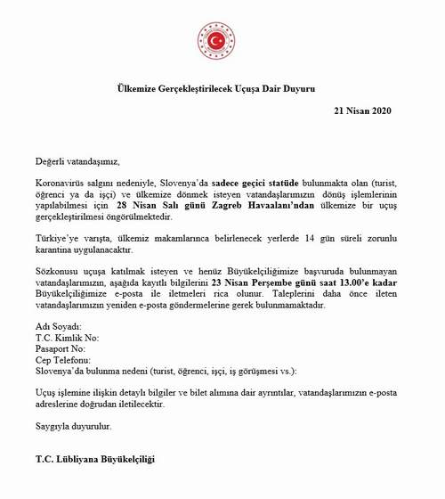 Koronovirüs salgını nedeniyle Slovenya’da geçici statüde bulunan turist , öğrenci ye işçilerin Türkiye’ye dönebilmeleri için 28 Nisan Salı günü Zagreb Havalimanı’ndan bir sefer gerçekleştirilecek.